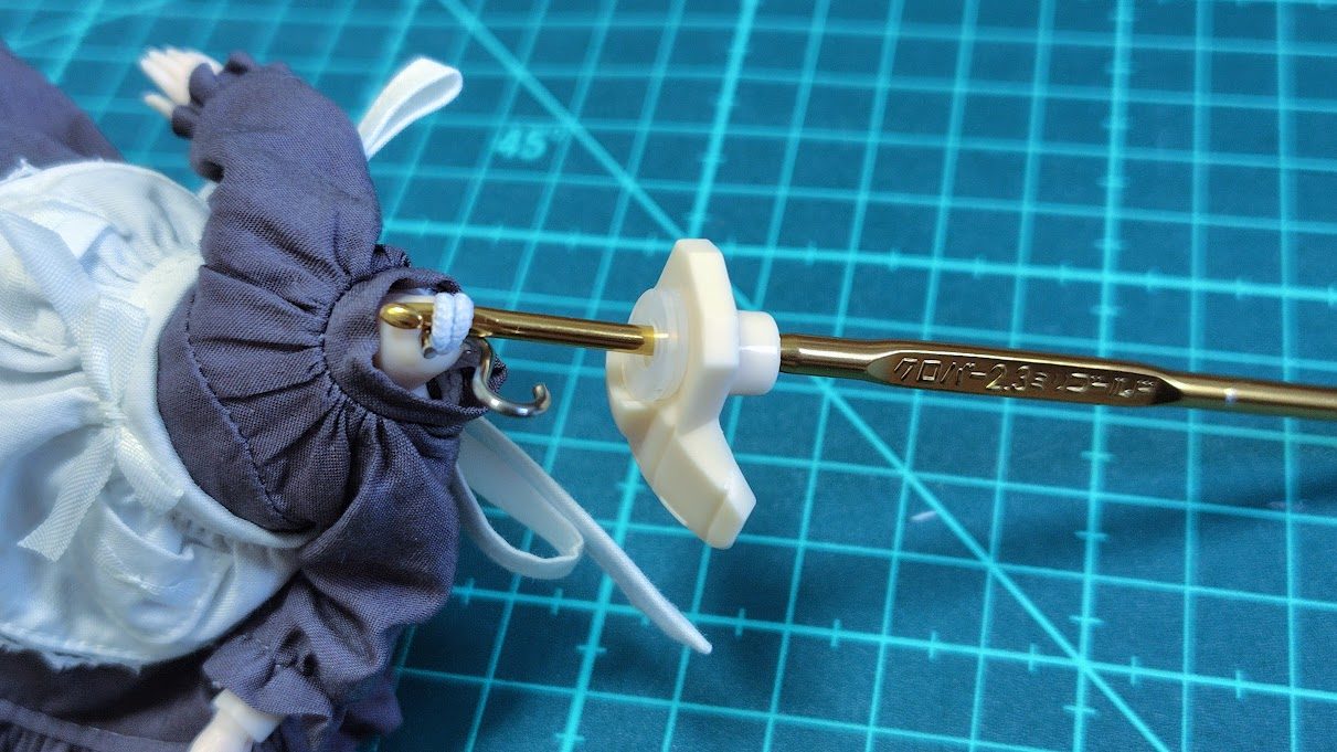 Sカンを慎重に外して、編み針をぐっと引き、ねんどろジョイントの穴へ通します。
