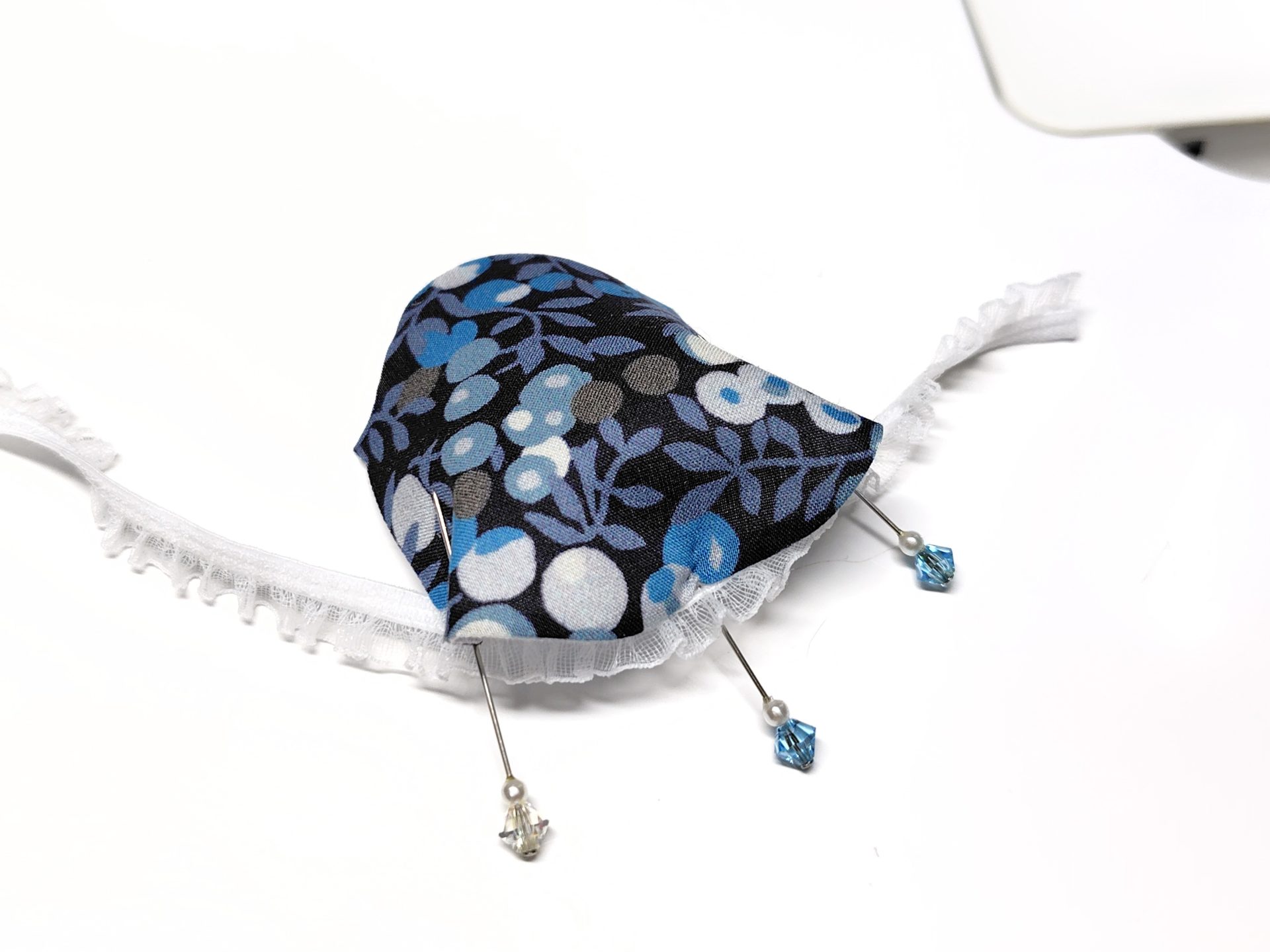写真はまち針で固定していますが、ストレッチフリルに印をつけて、押さえと針を刺して固定したら、真っ直ぐ右手で伸ばしながら左手で袖パーツのカーブを沿わせるように縫い付けました。その方が縫いやすいです。