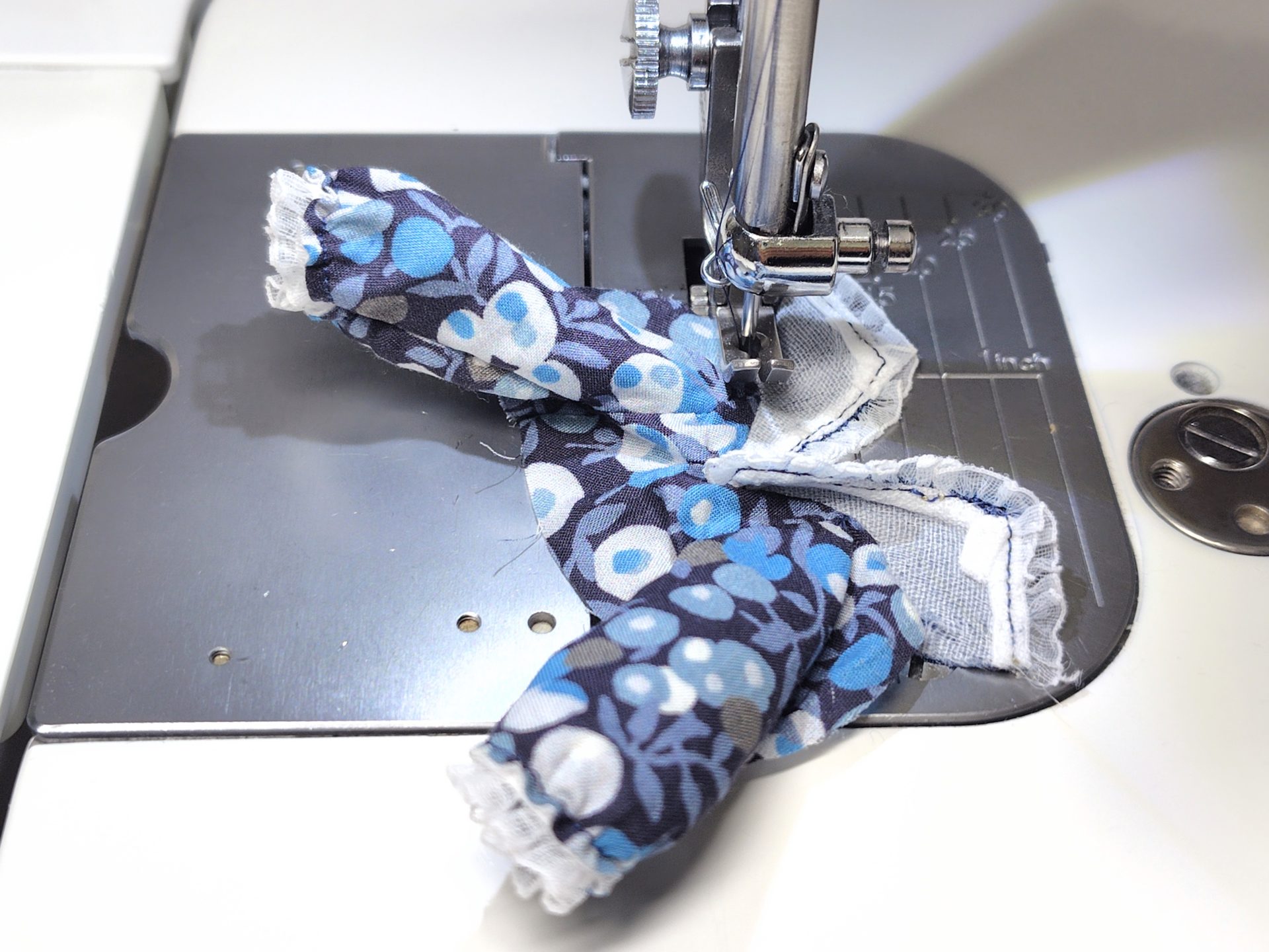 袖口にストレッチフリルを伸ばしながら縫い付けます。